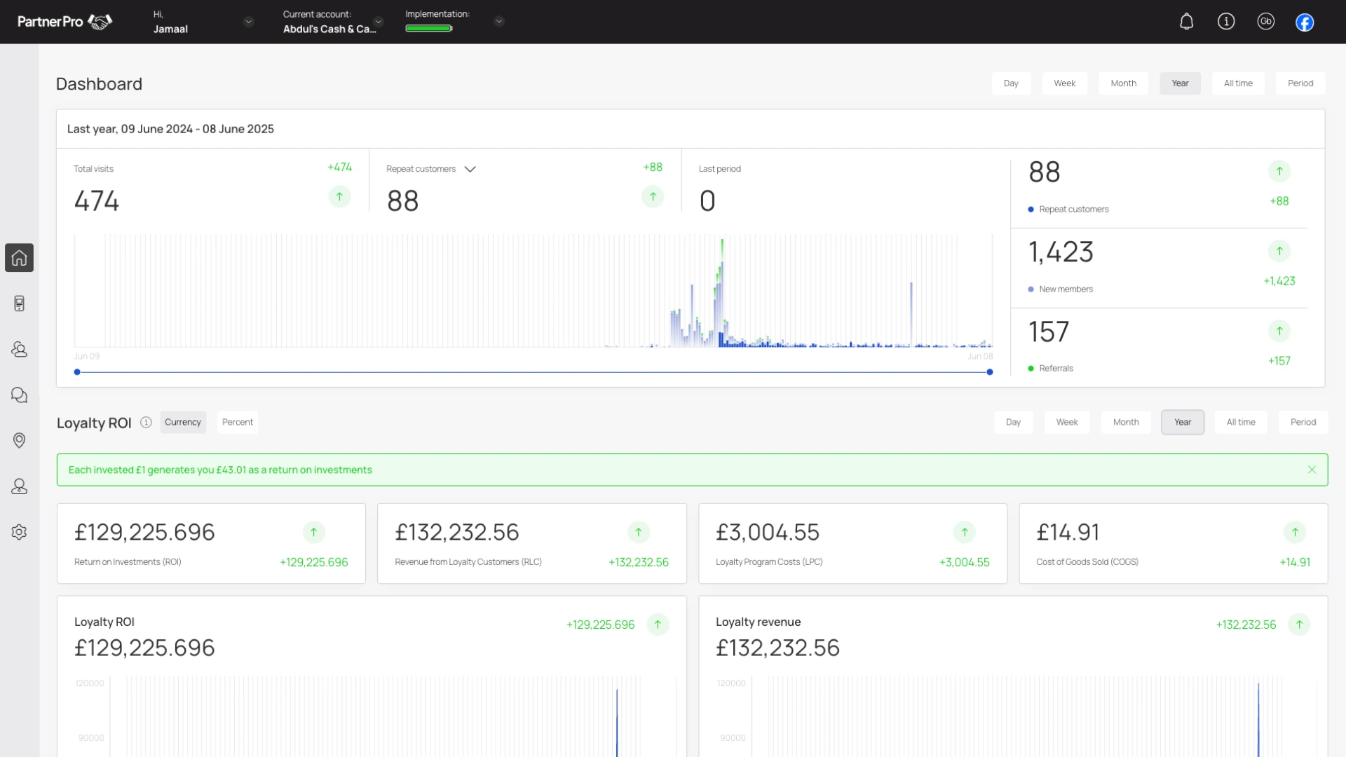 View real-time data on total revenue, average transaction value, and loyalty-driven sales.